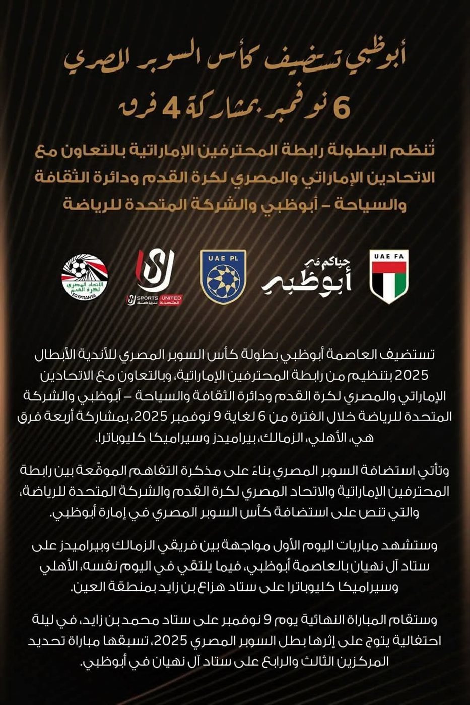 تستضيف العاصمة أبوظبي بطولة كأس السوبر المصري للأندية الأبطال 2025 بتنظيم من رابطة المحترفين الإماراتية، وبالتعاون مع الاتحادين الإماراتي والمصري لكرة القدم ودائرة الثقافة والسياحة - أبوظبي والشركة المتحدة للرياضة.