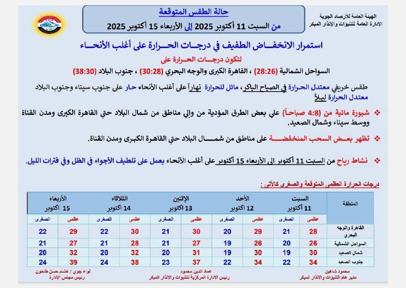 كما تشهد البلاد نشاطًا ملحوظًا للرياح على فترات متقطعة، يبدأ من اليوم السبت 11 أكتوبر ويستمر حتى الأربعاء 15 أكتوبر، مما يسهم في الإحساس بانخفاض درجات الحرارة.