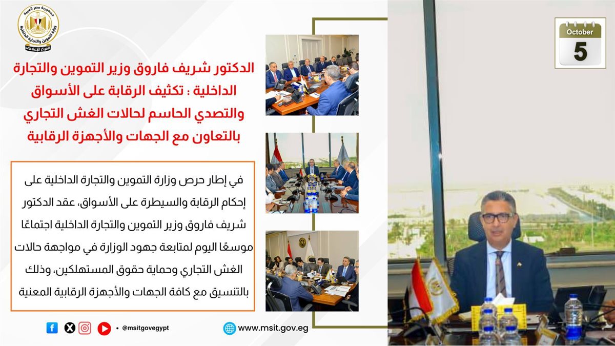 وفي هذا الصدد، عقد الدكتور شريف فاروق، وزير التموين والتجارة الداخلية، اجتماعًا موسعًا مع رئيس جهاز حماية المستهلك، ومدير الإدارة العامة لشرطة التموين والتجارة الداخلية، وقيادات الوزارة، مشددًا على أهمية تكثيف حملات الرقابة، والتصدي لممارسات الغش التجاري، بالتنسيق مع الجهات الرقابية المعنية، بما يضمن استقرار الأسواق وحماية المستهلك.