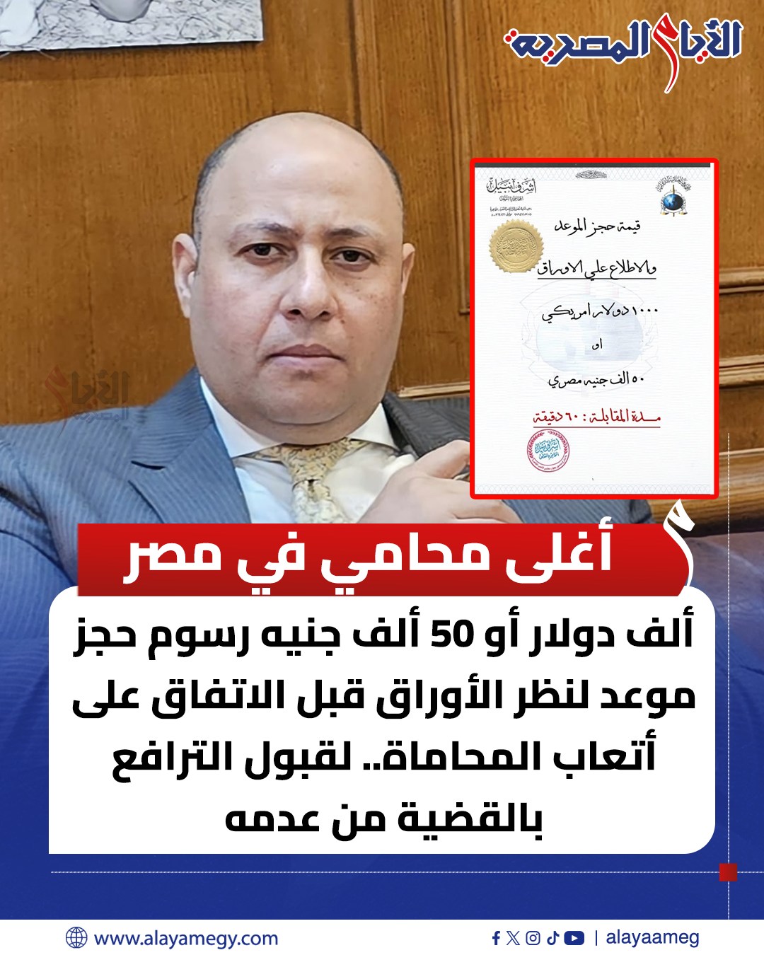 أغلى محامي في مصر، ألف دولار أو 50 ألف جنيه رسوم حجر موعد لنظر الأوراق