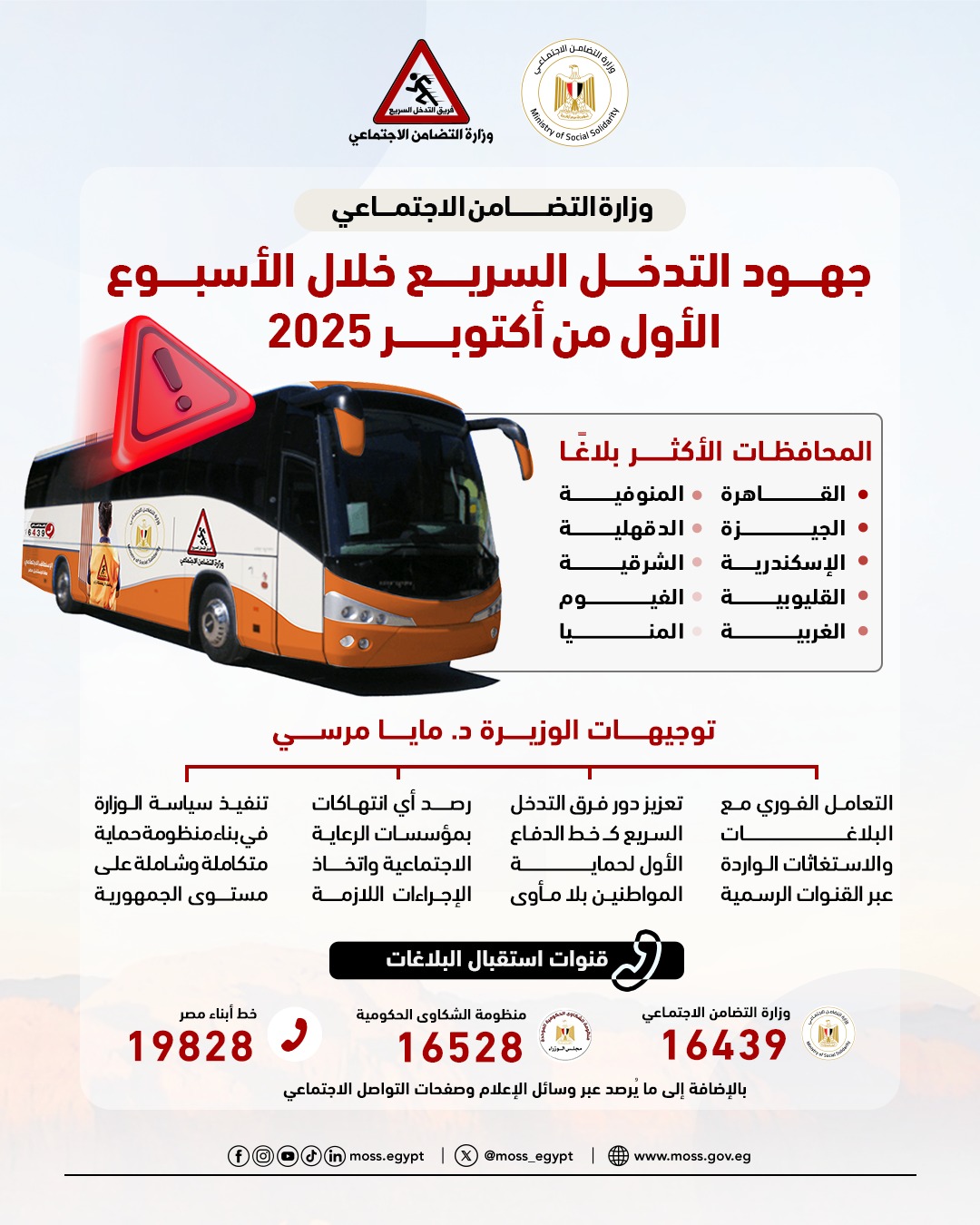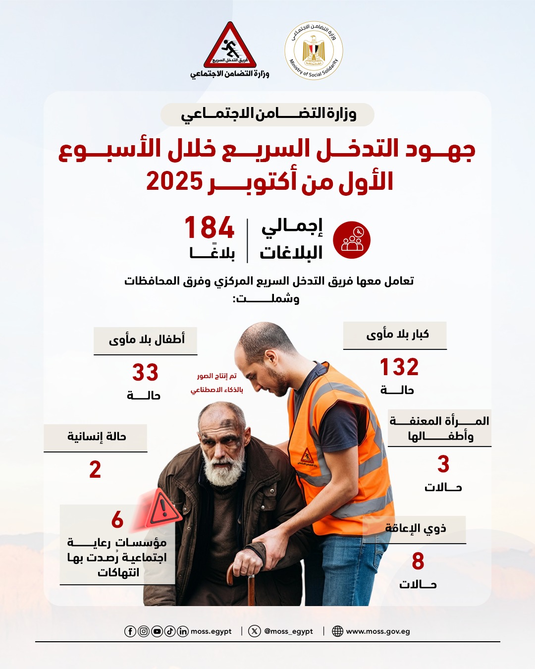 وقد بلغ عدد البلاغات التي تعامل معها فريق التدخل السريع خلال الأسبوع الأول من شهر أكتوبر الجاري نحو 184 بلاغًا متنوعًا، موزعة كالتالي "132 حالة كبار بلا مأوى، 33 حالة أطفال بلا مأوى، 3 حالات للمرأة المعنفة وأطفالها بدون مأوى، 2 حالة إنسانية، 8 حالات لذوي الإعاقة، و6 مؤسسات رعاية اجتماعية رصدت بها انتهاكات".