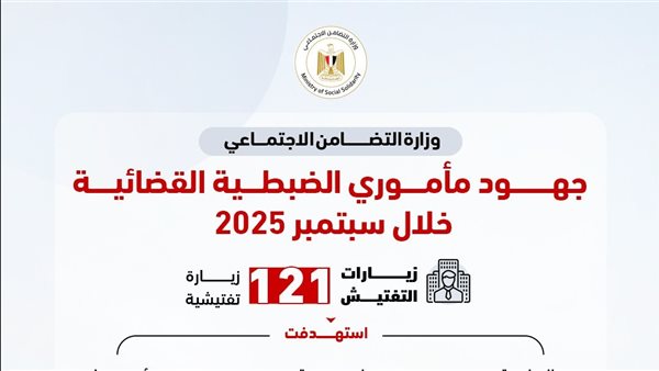 وبلغت عدد الزيارات التي تم تنفيذها من خلال مأموري الضبط القضائي بديوان عام الوزارة والمديريات التابعة لها خلال سبتمبر 2025 عدد 121 زيارة ما بين دور الرعاية الاجتماعية لرعاية الأيتام، ورعاية الأشخاص ذوي الإعاقة، ومؤسسات الدفاع الاجتماعي، وكانت أكثر الزيارات في محافظات القاهرة والإسكندرية والجيزة والغربية والدقهلية.