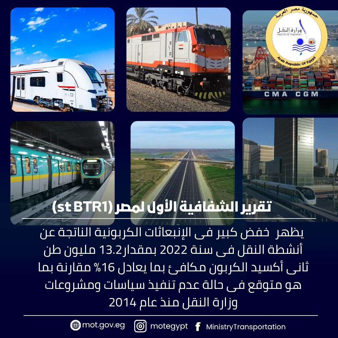 وأظهر تقرير الشفافية الأول لمصر (1st BTR) انخفاضًا كبيرًا في الانبعاثات الكربونية الناتجة عن أنشطة النقل عام 2022، إذ تم خفض الانبعاثات بمقدار 13.2 مليون طن من ثاني أكسيد الكربون مكافئ، ما يعادل 16% مقارنة بالسيناريو المتوقع دون تنفيذ السياسات والمشروعات الجديدة منذ 2014، هذا التراجع يرجع إلى تقليل مسافات التنقل، خفض الازدحامات، وتقصير زمن الرحلات، ما أسهم في تقليل استهلاك الوقود.