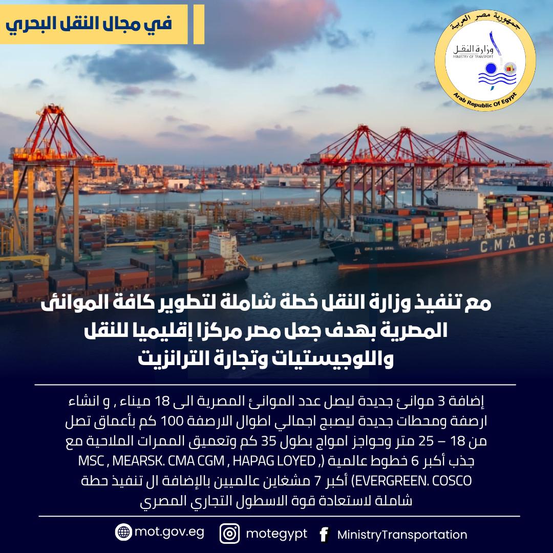 في مجال النقل البحري، نفذت وزارة النقل خطة شاملة لتطوير 18 ميناءً بحريًا، بينها 3 موانئ جديدة، مع إنشاء أرصفة ومحطات حديثة وممرات ملاحية عميقة، ونتج عن هذه الجهود جذب أكبر 6 خطوط ملاحية عالمية وتعزيز قوة الأسطول التجاري المصري.