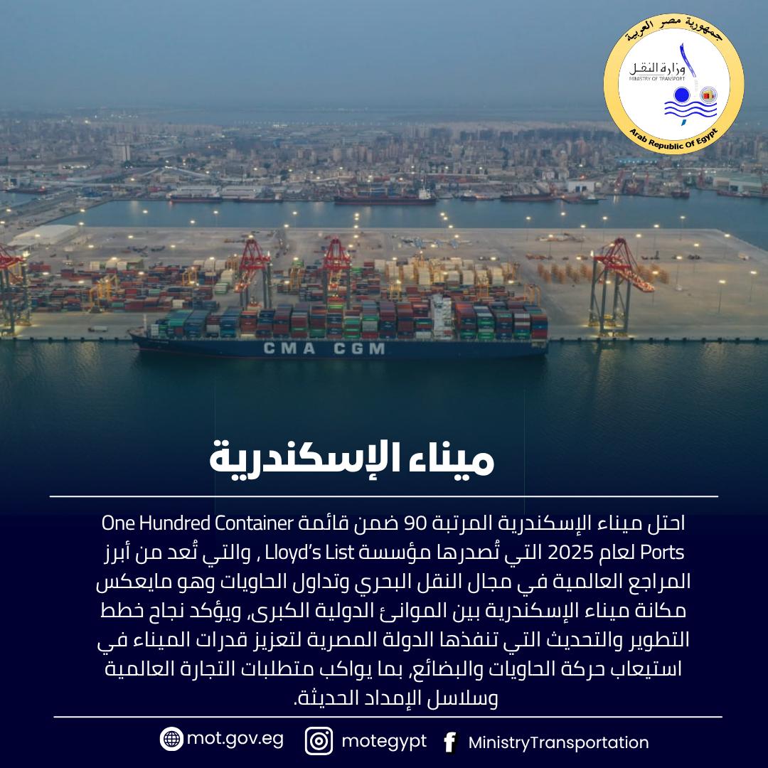 كما حقق ميناء الإسكندرية تقدمًا ملحوظًا بحصوله على المركز 90 ضمن قائمة أفضل 100 ميناء حاويات عالميًا، مع زيادة قياسية في حركة السفن وتداول البضائع، وتحديث تقنيات إدارة الأرصفة.
