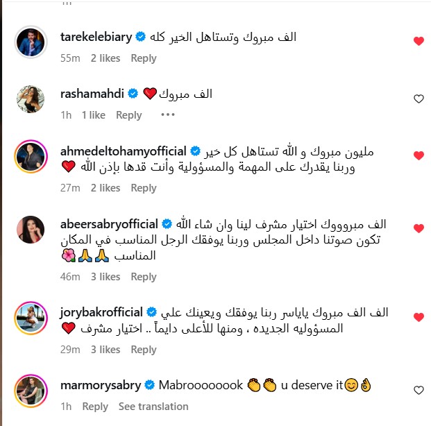 وشارك عدد من نجوم الوسط الفني، الفنان ياسر جلال فرحته بتعيينه ضمن قائمة الـ 100 نائب بمجلس الشيوخ، وعلقوا ليعربوا عن سعادتهم.