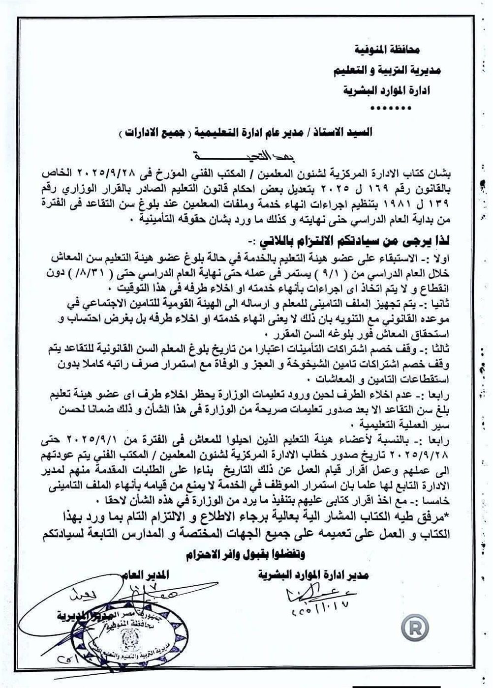 وأشارت المديريات التعليمية إلى أنه يتم على الفور وقف خصم اشتراكات التأمينات اعتبارًا من بلوغ المعلم السن القانونية للتقاعد ووقف خصم اشتراكات تأمين الشيخوخة والعجز والوفاة، مع استمرار صرف مرتبه كامل بدون استقطاع التأمين والمعاشات.