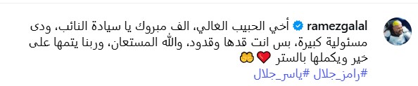 وعلق رامز نصًا: “أخي الحبيب الغالي، الف مبروك يا سيادة النائب، ودى مسئولية كبيرة، بس انت قدها وقدود، والله المستعان، وربنا يتمها على خير ويكملها بالستر”.