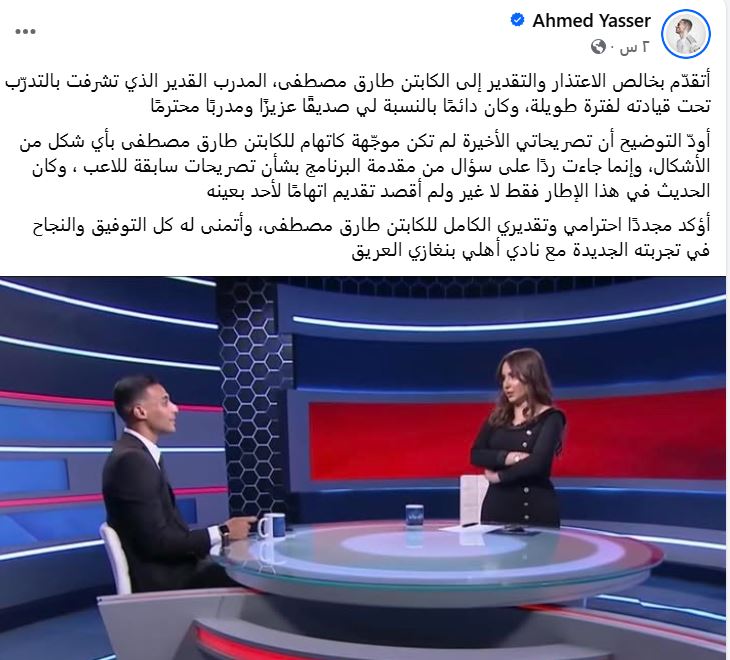 ونشر أحمد ياسر عبر حسابه الشخصي على موقع التواصل الاجتماعي فيسبوك، وكتب: أتقدّم بخالص الاعتذار والتقدير إلى الكابتن طارق مصطفى، المدرب القدير الذي تشرفت بالتدرّب تحت قيادته لفترة طويلة، وكان دائمًا بالنسبة لي صديقًا عزيزًا ومدربًا محترمًا.