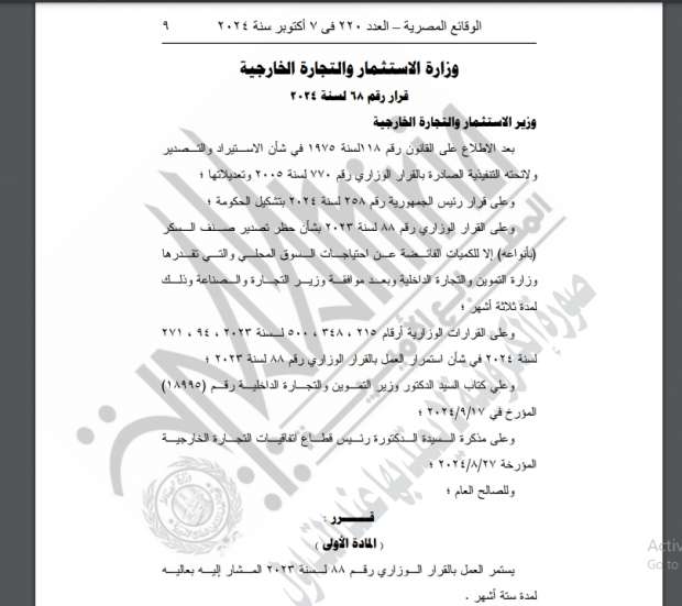 القرار الذي نشر اليوم الاثنين 13 أكتوبر 2025 في العدد 228 من الوقائع المصرية تحت رقم 394 لسنة 2025، يهدف إلى تأمين احتياجات السوق المحلي وتوفير المخزون الاستراتيجي من السلعة الحيوية.