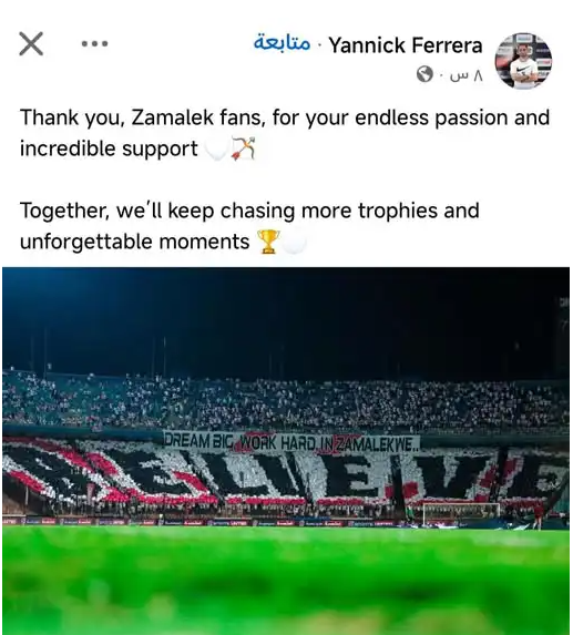 ونشر فيريرا صورة لجماهير الزمالك عبر حساباته الرسمية على مواقع التواصل الاجتماعي، وكتب عليها:"شكرًا لكم يا مشجعي الزمالك على شغفكم اللامتناهي ودعمكم الرائع”.