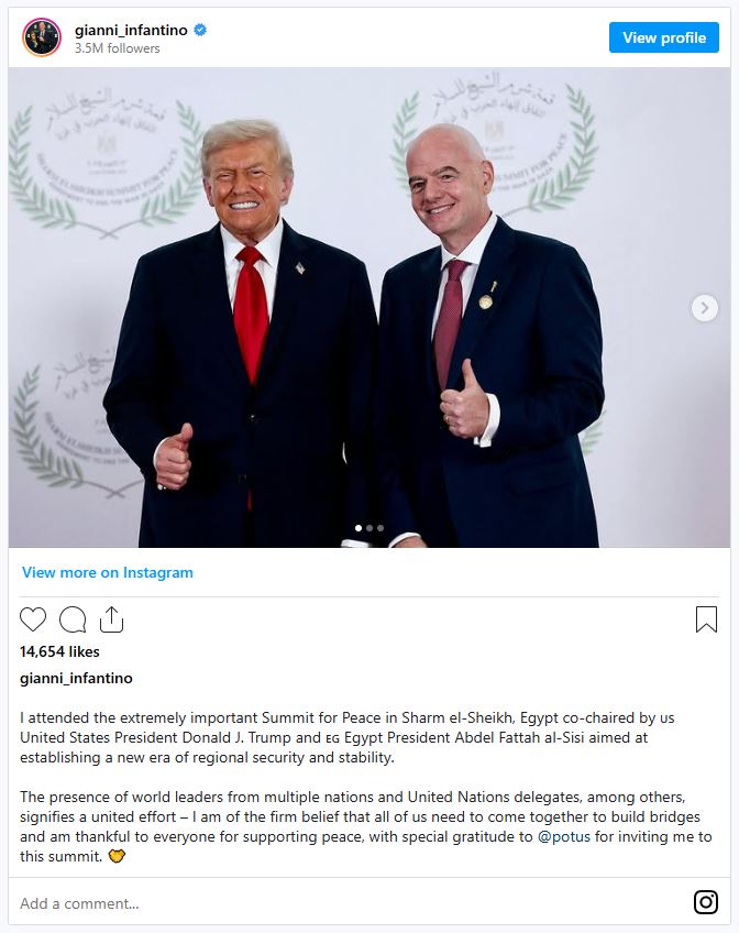 وأضاف: "الرئيس ترامب، فجر جديد للمنطقة بأسرها، للعالم أجمع، إنه لأمر بالغ الأهمية للفيفا أن تكون هنا للدعم والمساعدة، وأن تضع نفسها في متناول الجميع لضمان نجاح عملية السلام هذه وتحقيق أفضل نتيجة ممكنة." مؤكدًا على القيادة الحاسمة التي يوفرها رئيس الولايات المتحدة.