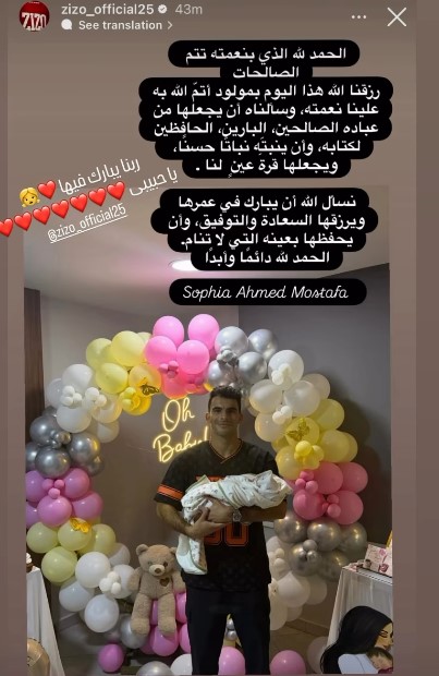 اسأل الله أن يجعلها من الصالحين، هكذا استقبل أحمد سيد زيزو مولودته صوفيا