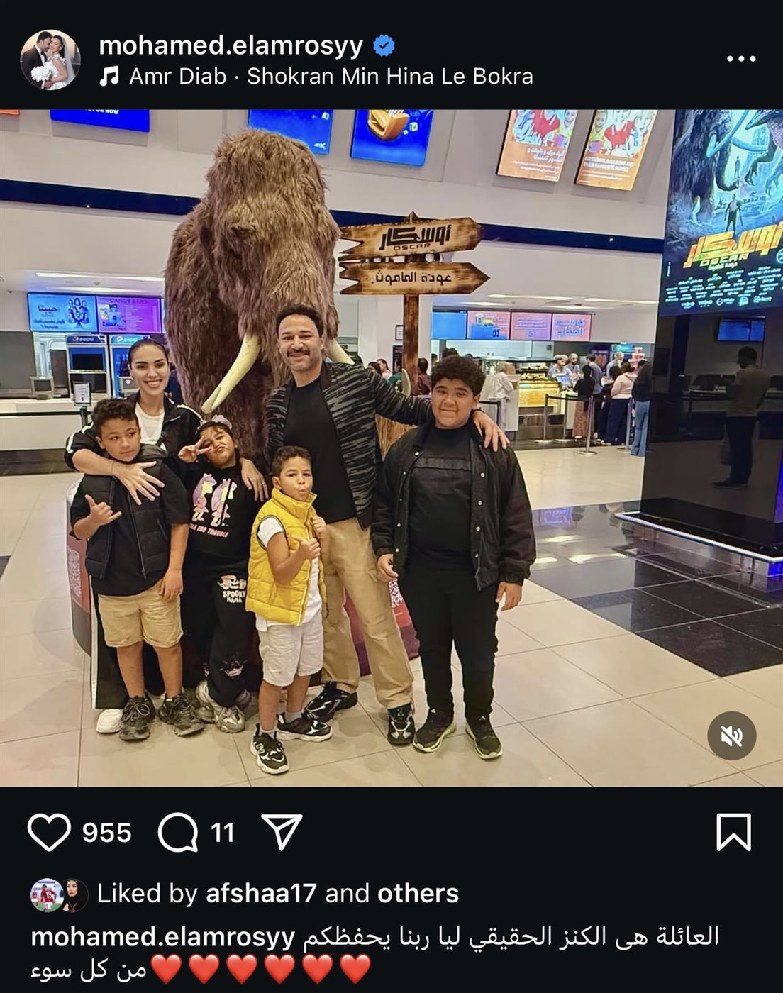 وعلق الفنان محمد العمروسي عليها بقوله: "العائلة هي الكنز الحقيقي ليا ربنا يحفظكم من كل سوء"، في رسالة واضحة تنفي ادعاءات طليقته الممثلة مي فاروق، بعدم دعمه المادي لابنيه منذ الطلاق قبل خمس سنوات.