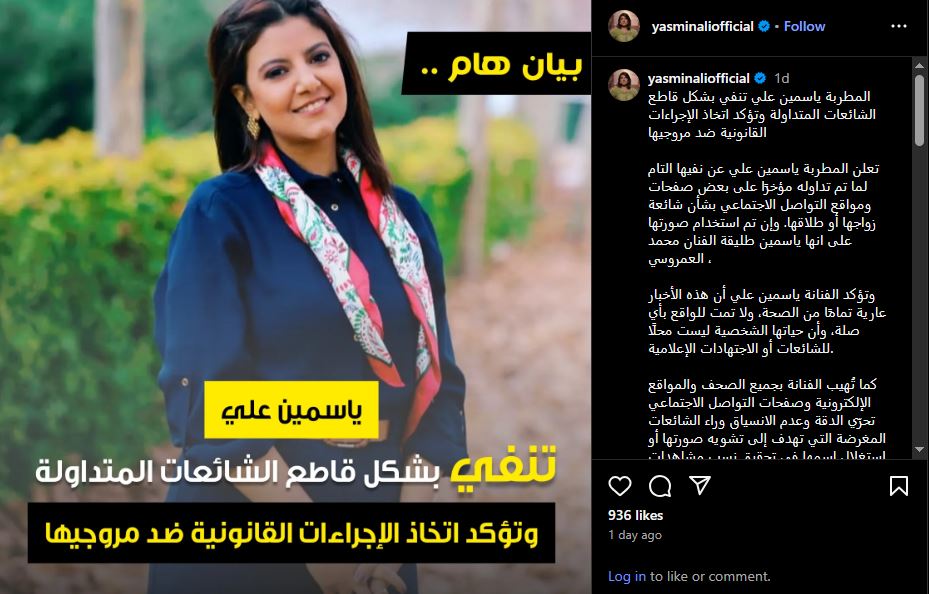 وأشارت ياسمين على: "كما تُهيب الفنانة بجميع الصحف والمواقع الإلكترونية وصفحات التواصل الاجتماعي تحرّي الدقة وعدم الانسياق وراء الشائعات المغرضة التي تهدف إلى تشويه صورتها أو استغلال اسمها في تحقيق نسب مشاهدات أو تفاعلات."