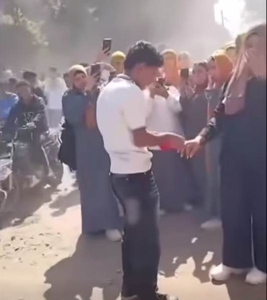 الفيديو أظهر الشاب وهو ينزل من سيارة ملاكي أمام إحدى مدراس البنات، وقدم خاتم الخطوبة لإحدى الطالبات أثناء خروجها من المدرسة، ثم فاجأ الجميع بتقبيل يدها.