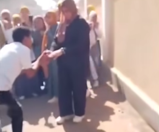 تداول نشطاء على مواقع التواصل الاجتماعي، مقطع فيديو لشاب فاجئ طالبة أمام مدرستها، بعرض (شو) أمام التلاميذ ليقدم لها خاتم الخطوبة، ويقبل يدها.
