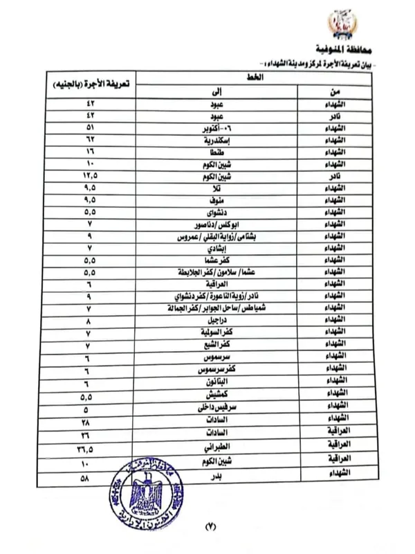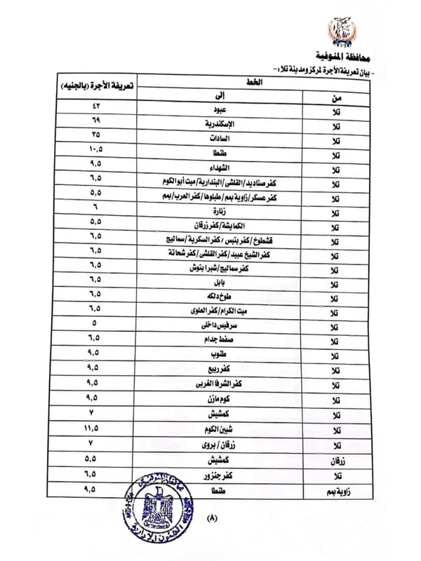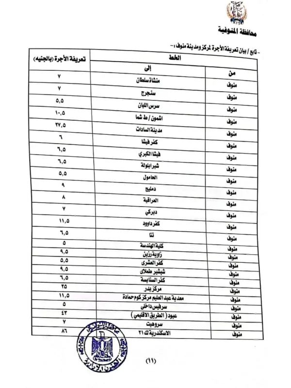 ويستعرض لكم موقع الأيام المصرية تسعيرة محافظة المنوفية والتعريفة الجديدة لركوب سيارات الأجرة ووسائل النقل الخارجية و الداخلية للمحافظة وكذلك النقل العام.