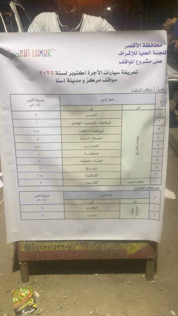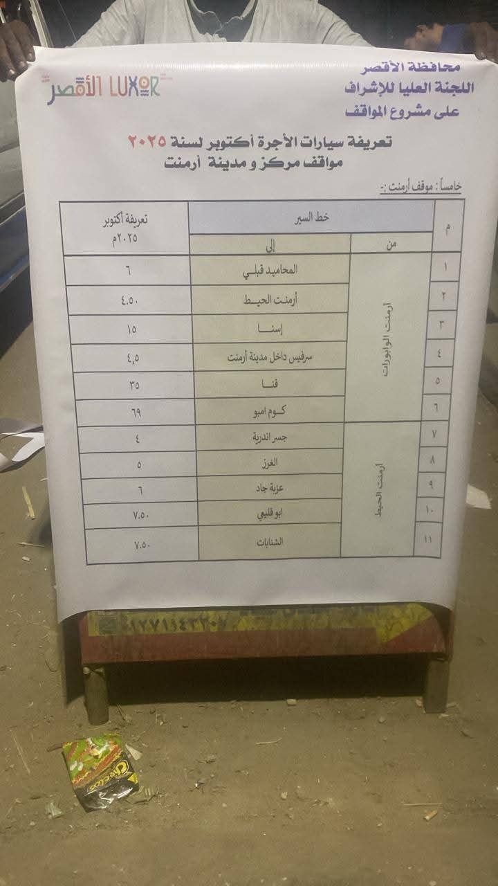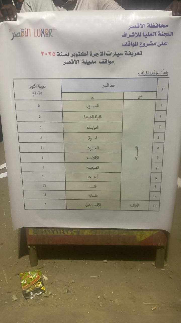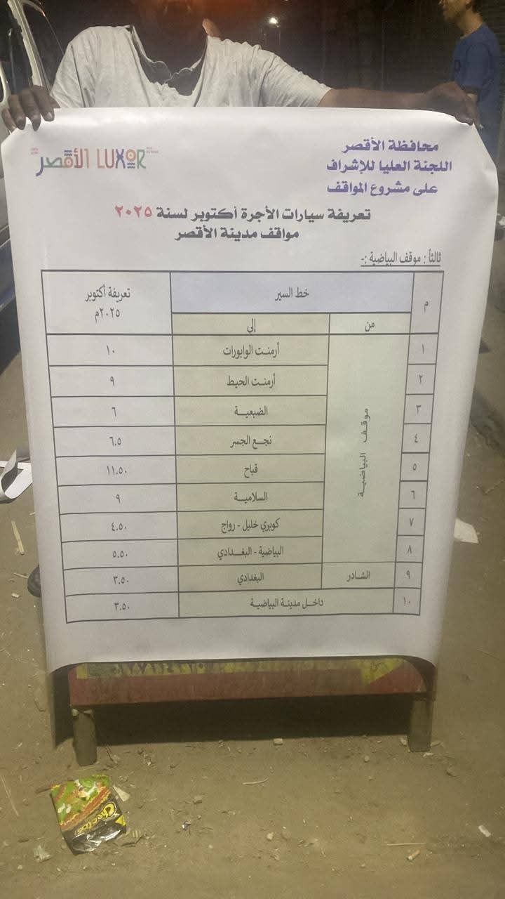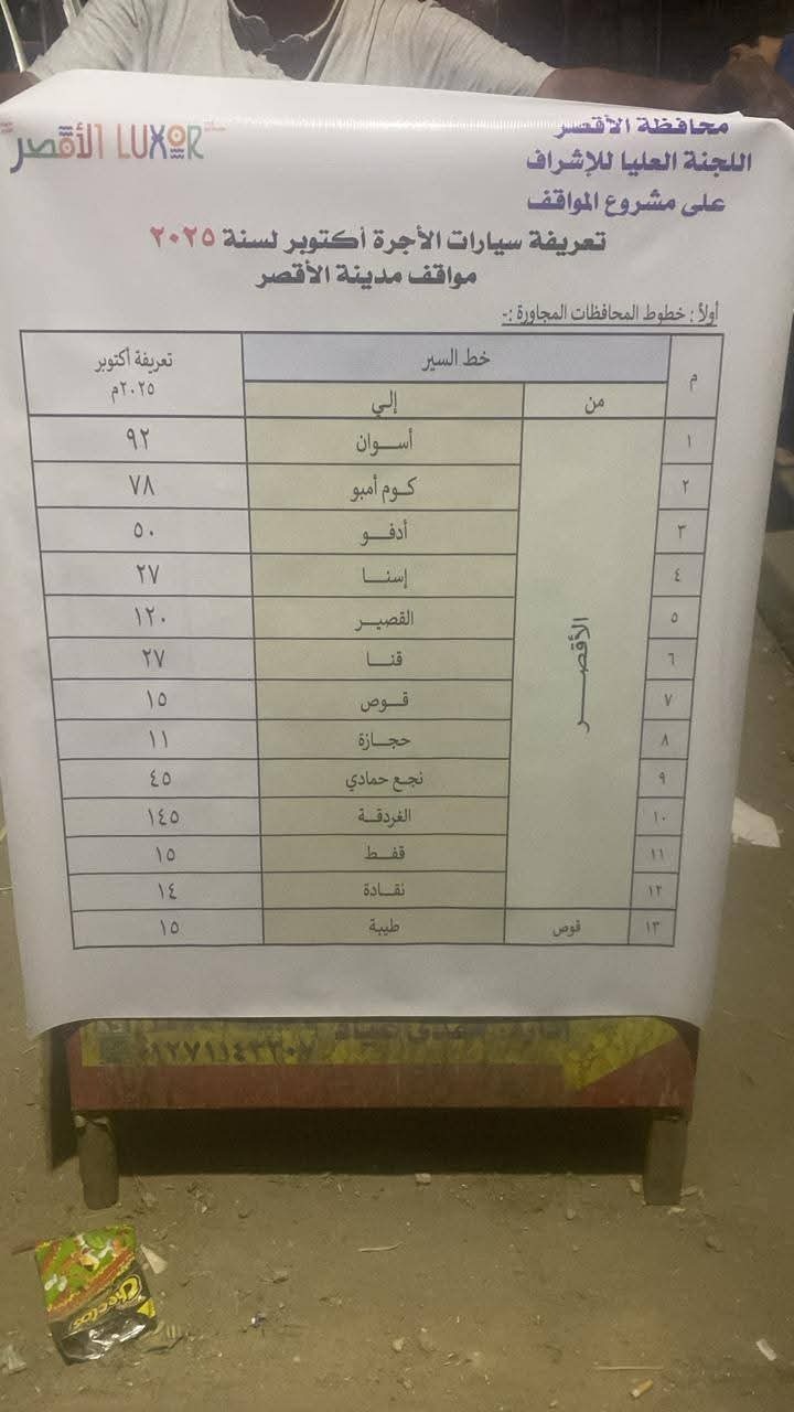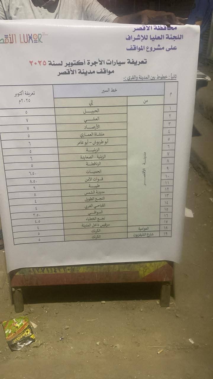 تعريفة الركوب محافظة الأقصر، أعلنت محافظة الأقصر، صباح اليوم الجمعة 17 أكتوبر 2025، لتعريفة الجديدة لوسائل النقل الداخلي والخارجي بالمحافظة بزيادة بلغت 13%، وذلك خلال اجتماعها برئاسة اللواء هشام الشيمي، السكرتير العام المساعد للمحافظة ورئيس اللجنة العليا، وبحضور مدير المرور، ومدير مباحث المرور، ومدير عام الشؤون المالية والإدارية، ومدير الشؤون القانونية، ومدير إدارة المواقف.