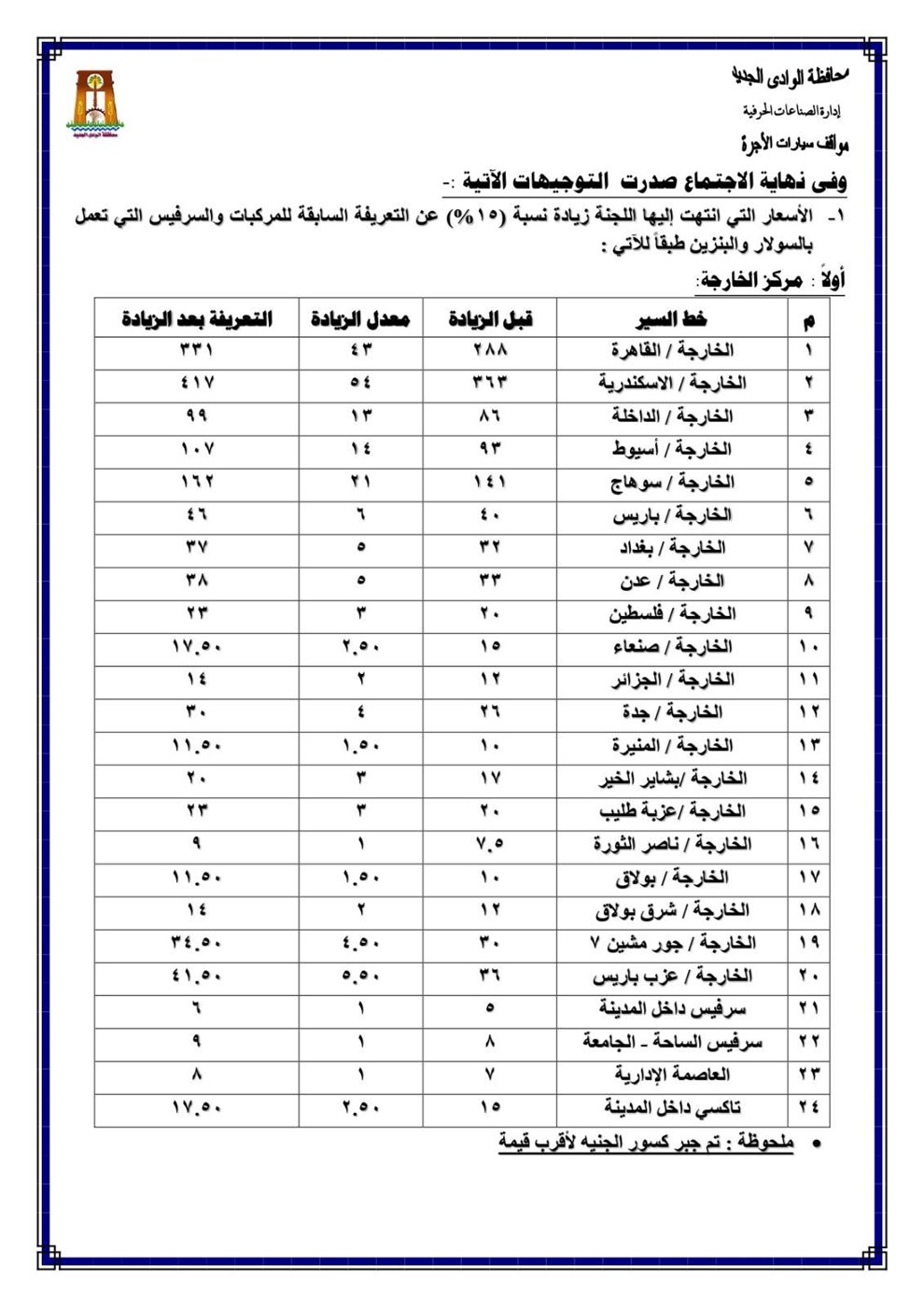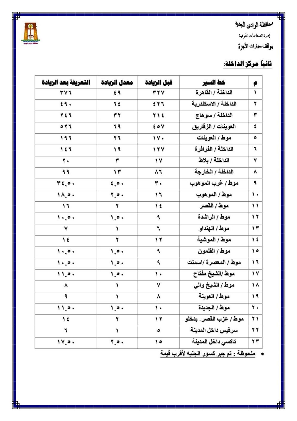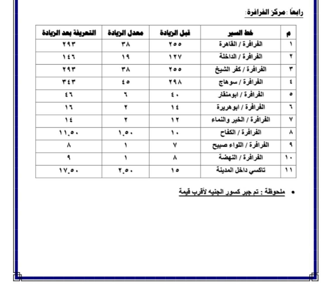 تعريفة الركوب محافظة الوادي الجديد بعد زيادة أسعار البنزين الجديدة