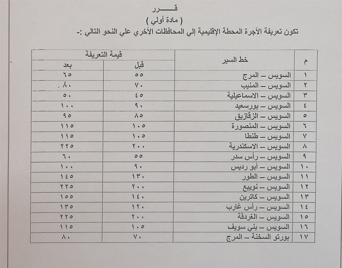 تعريفة الركوب محافظة السويس بعد زيادة أسعار البنزين الجديدة