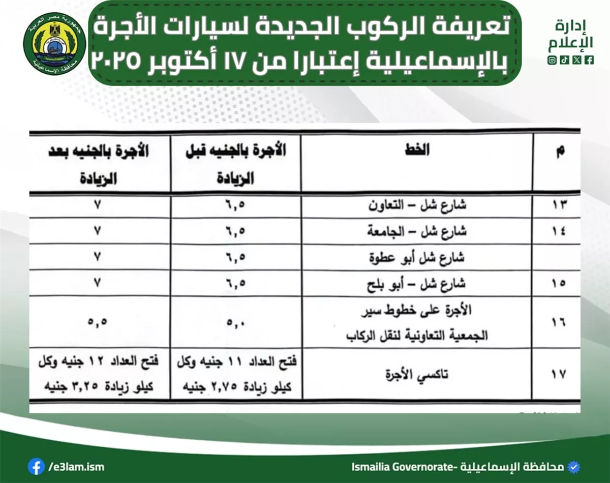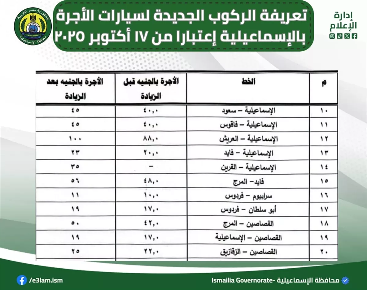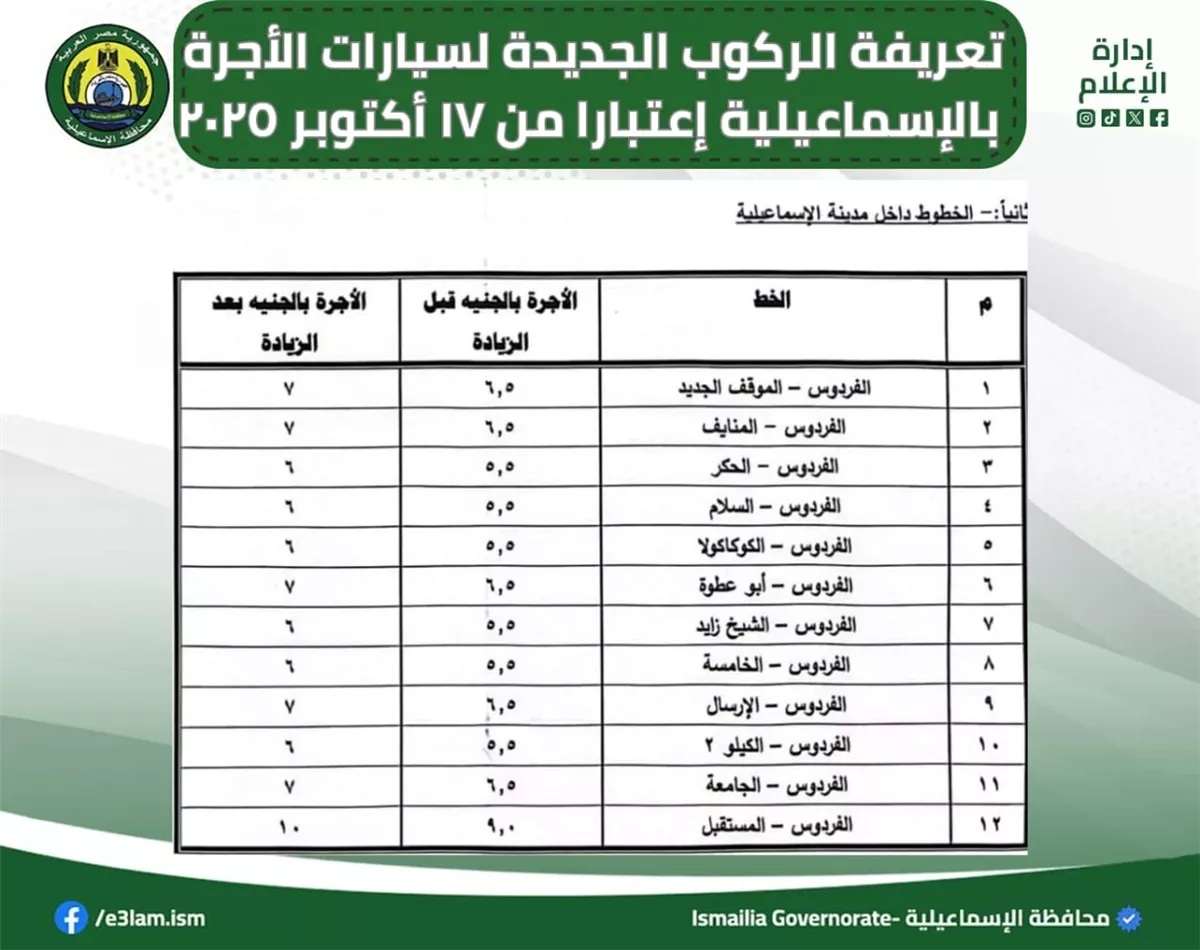 أعلنت محافظة الإسماعيلية تعريفة الركوب الجديدة لخطوط سير السرفيس والتاكسي وسيارات الأجرة العاملة على الخطوط الداخلية والخارجية بين مراكز المحافظة، والمحافظات الأخرى، وذلك بعد إعلان لجنة التسعير التلقائي للمنتجات البترولية، تحريك أسعار البنزين والسولار، بدءًا من الساعة 6 صباح اليوم الجمعة 17 أكتوبر 2025.