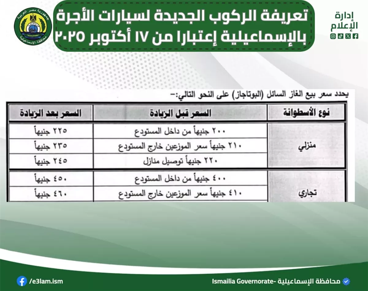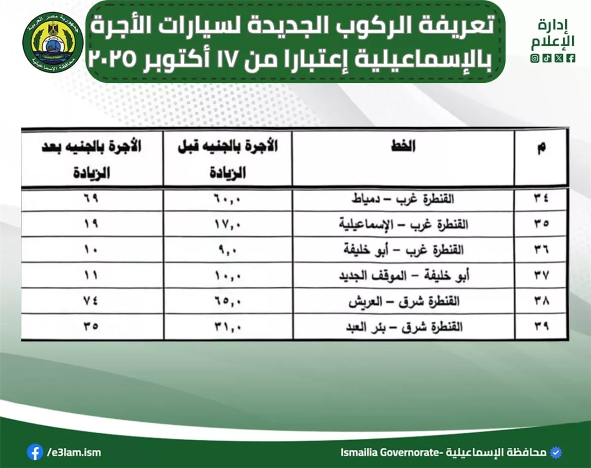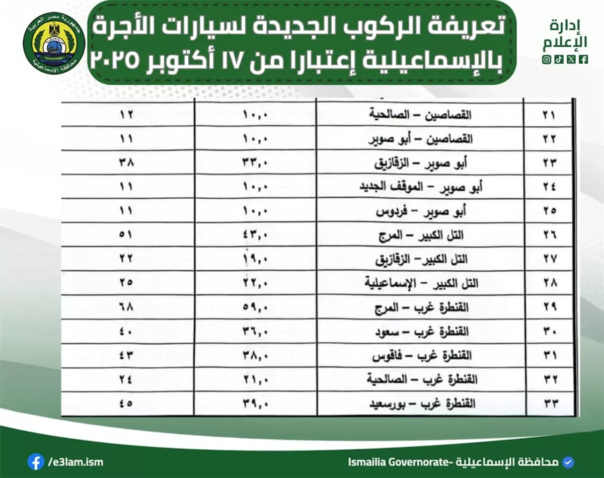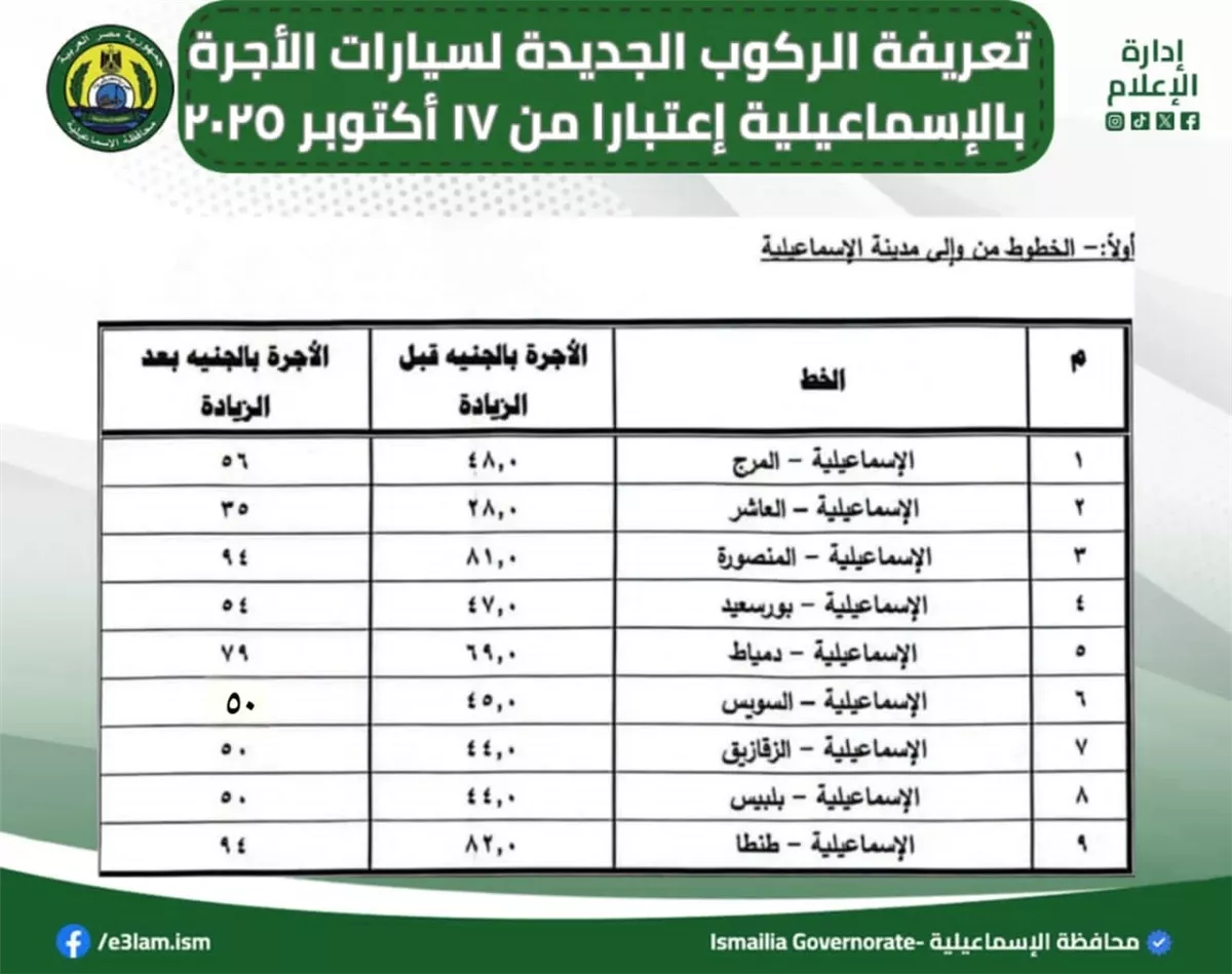 أعلنت محافظة الإسماعيلية تعريفة الركوب الجديدة لخطوط سير السرفيس والتاكسي وسيارات الأجرة العاملة على الخطوط الداخلية والخارجية بين مراكز المحافظة، والمحافظات الأخرى، وذلك بعد إعلان لجنة التسعير التلقائي للمنتجات البترولية، تحريك أسعار البنزين والسولار، بدءًا من الساعة 6 صباح اليوم الجمعة 17 أكتوبر 2025.