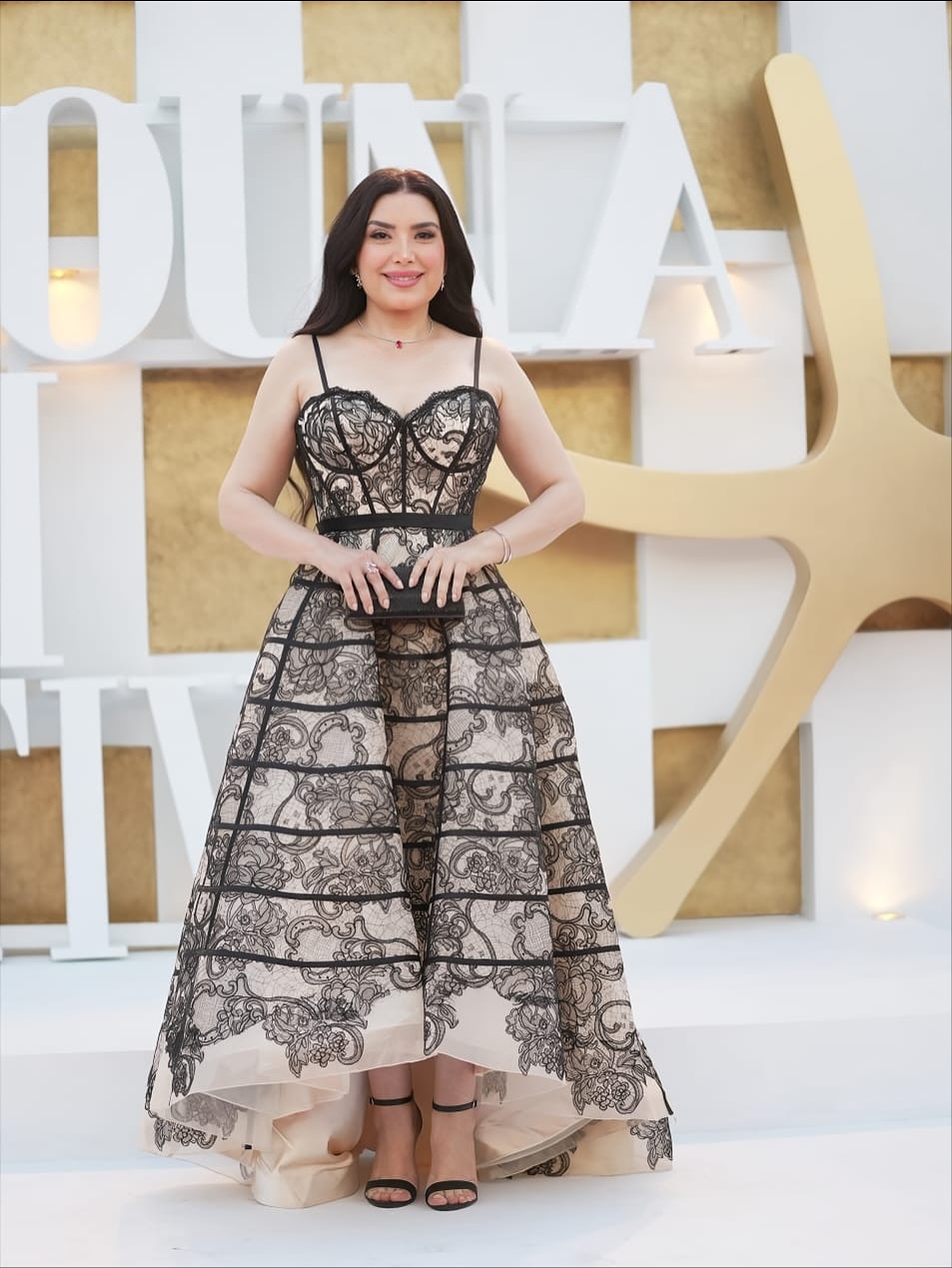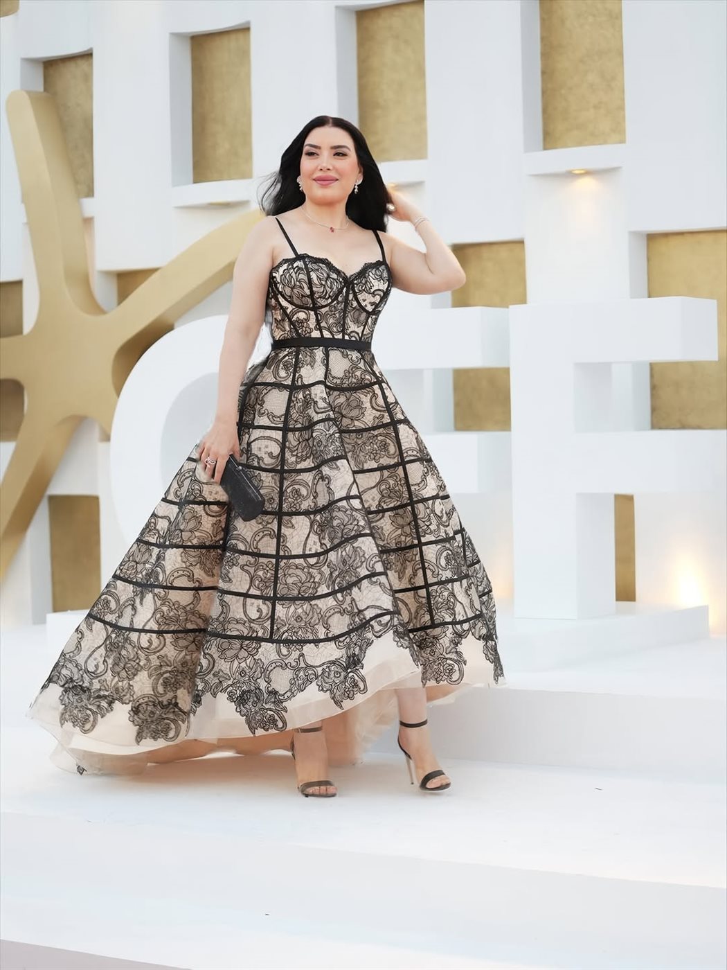 اختارت عبير صبري فستانًا راقيًا باللونين البيج والأسود، تميز بتصميم أنثوي راقي ذي صدر كورسيه ناعم وحمالات رفيعة أبرزت جمال إطلالتها، فيما جاءت التنورة واسعة من الدانتيل المزخرف بخطوط سوداء أضافت لمسة من الفخامة العصرية.