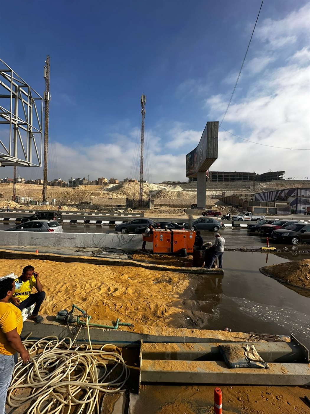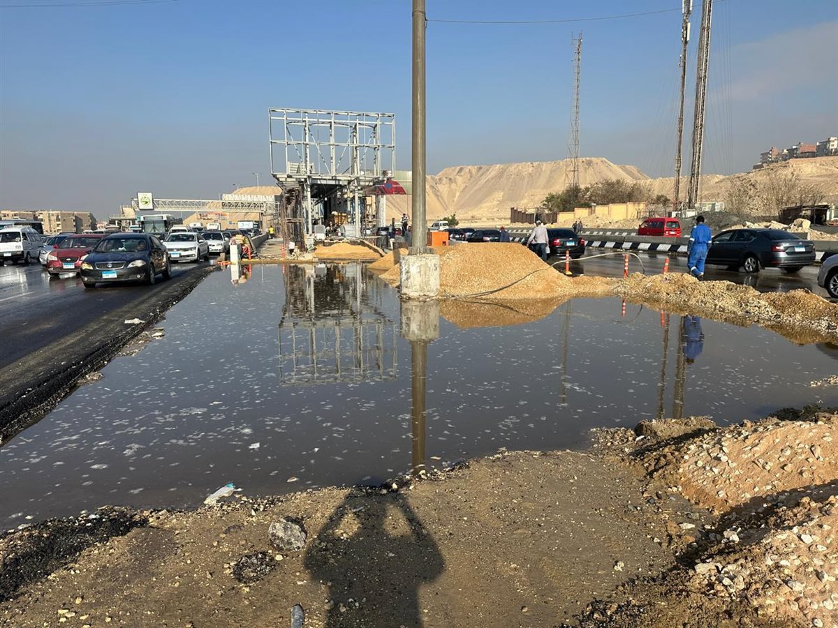 بالصور، كسر ماسورة مياه على الطريق الدائري في الأوتوستراد