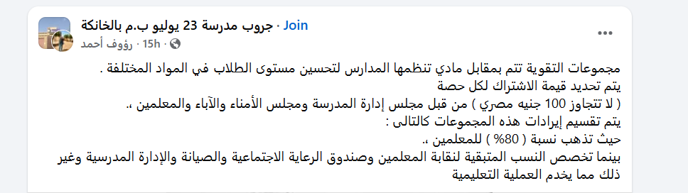 وأوضح القرار أن تقسيم قيمة الاشتراك يتم من خلال إعطاء 80% من قيمة الاشتراك للمعلم، بعد خصم 15% من المحصلات المالية لحساب وزارة المالية، وتحسب النسبة المتبقية كـ 100% توزع منها 80% للمعلم القائم على مجموعات التقوية، ويتسلمها بمجرد الانتهاء من المجموعة واستيفاء النسب القانونية كالضرائب وغيرها.