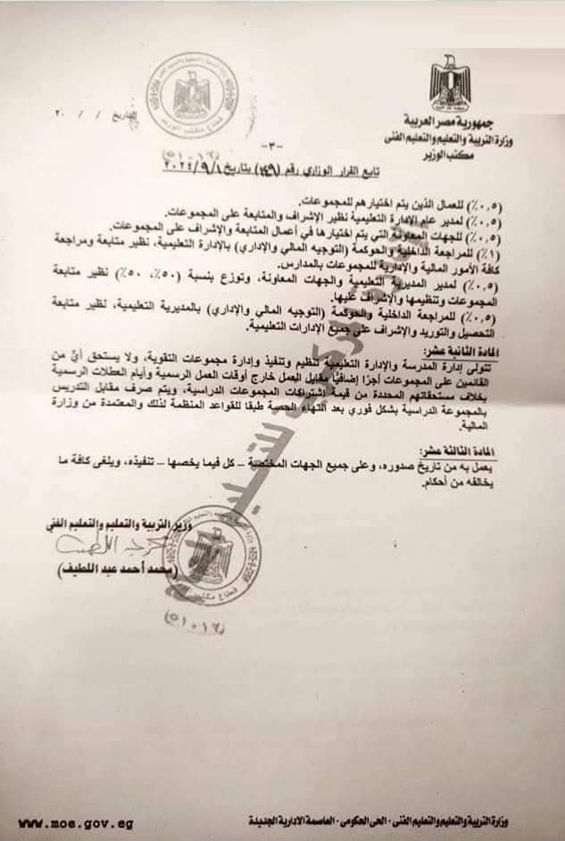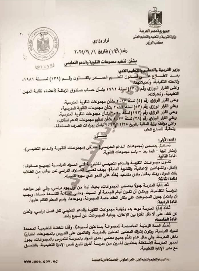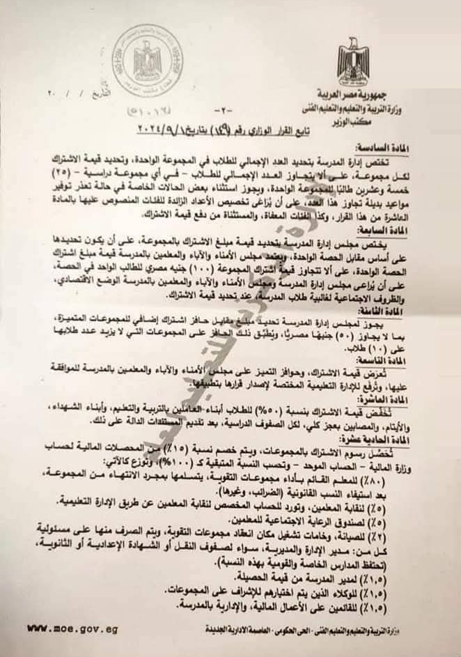 ونص القرار على أنه من المقرر أن يختص مجلس إدارة المدرسة بتحديد قيمة مبلغ الاشتراك بمجموعات التقوية على أن يكون تحديدها على أساس مقابل الحصة الواحدة، ويحدد مجلس الأمناء والأباء والمعلمين بالمدرسة قيمة الحصة على ألا تزيد قيمة اشتراك المجموعة عن 100 جنيه للطالب في الحصة، ولكن يجب مراعاة الظروف الاجتماعية والاقتصادية لغالبية الطلاب في المدرسة عند تحديد قيمة الاشتراك.
