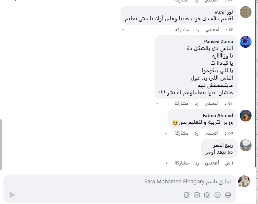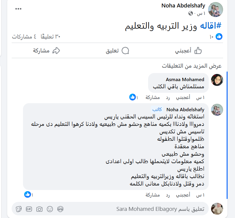ومن جهتهم استغاث عدد من أولياء الأمور بسبب كمية المناهج المقررة على طلاب المراحل الابتدائية، قائلين: "دمروا أولادنا بكمية مناهج وحشو مش طبيعية، أولادنا كرهوا التعليم، دي مرحلة تأسيس مش تكديس، ظلموا وقتلوا الطفولة، مناهج معقدة، وحشو مش طبيعي، كمية معلومات لا يتحملها طالب أولى إعدادي، نطالب بإقالة وزير التربية والتعليم، دمر وقتل أولادنا بكل معاني الكلمة"، وفي تعليق آخر: "مستلمناش باقي الكتب"، وفي تعليق آخر: "ولا كتب ولا تقييمات، ويقولوا الامتحانات هتيجي منهم، دي تقييمات مستفزة لا يتحملها طالب ثالثة إعدادي".
