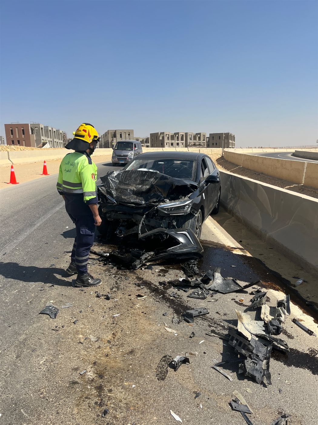 ونتج عن التصادم بقعة زيت على مساحة كبيرة حوالى 3 أمتار، تم التعامل معها بمعرفة القوات وتسيير الحركة المرورية.