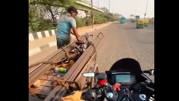ووفق الفيديو، كان سائق الدراجة يحاول طلوع الكوبري وهو محمل بالحديد، إلا أن ثِقل الحديد منعه من ذلك، ليفاجئ بشاب على موتوسيكل يساعده في دفع الدراجة إلى أعلى الكوبري.
