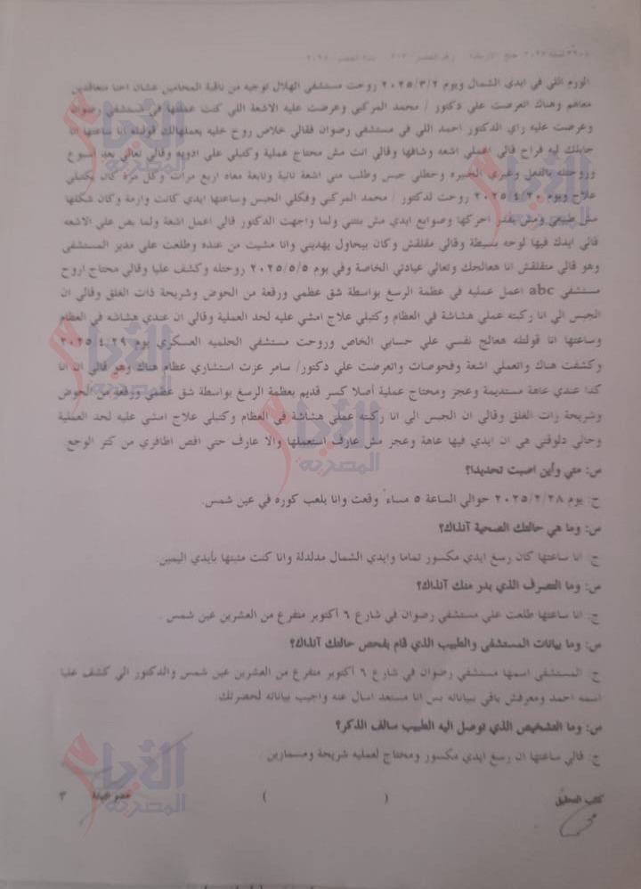 ويوم 2 / 3 / 2025 ، رحت مستشفى الهلال بتوجيه من نقابة المحامين (عمال مصر)، وهناك قابلت دكتور اسمه محمد المراكبي، وعرضت عليه الأشعة اللي كنت عاملها في مستشفى الخاصة ، وقلت له إن دكتور أحمد قال لي محتاج عملية، فرد علي وقال: “مش محتاج عملية دلوقتي، خليك على العلاج وتعالى بعد أسبوع”.