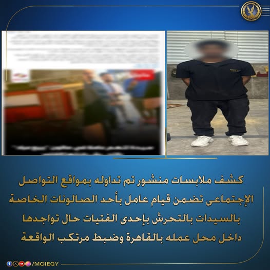 كشفت الأجهزة الأمنية بوزارة الداخلية ملابسات منشور تم تداوله عبر مواقع التواصل الاجتماعي، تضمن قيام عامل بأحد الصالونات الخاصة بالسيدات بالتحرش بفتاة أثناء تواجدها داخل محل عمله بمنطقة التجمع الأول بالقاهرة.