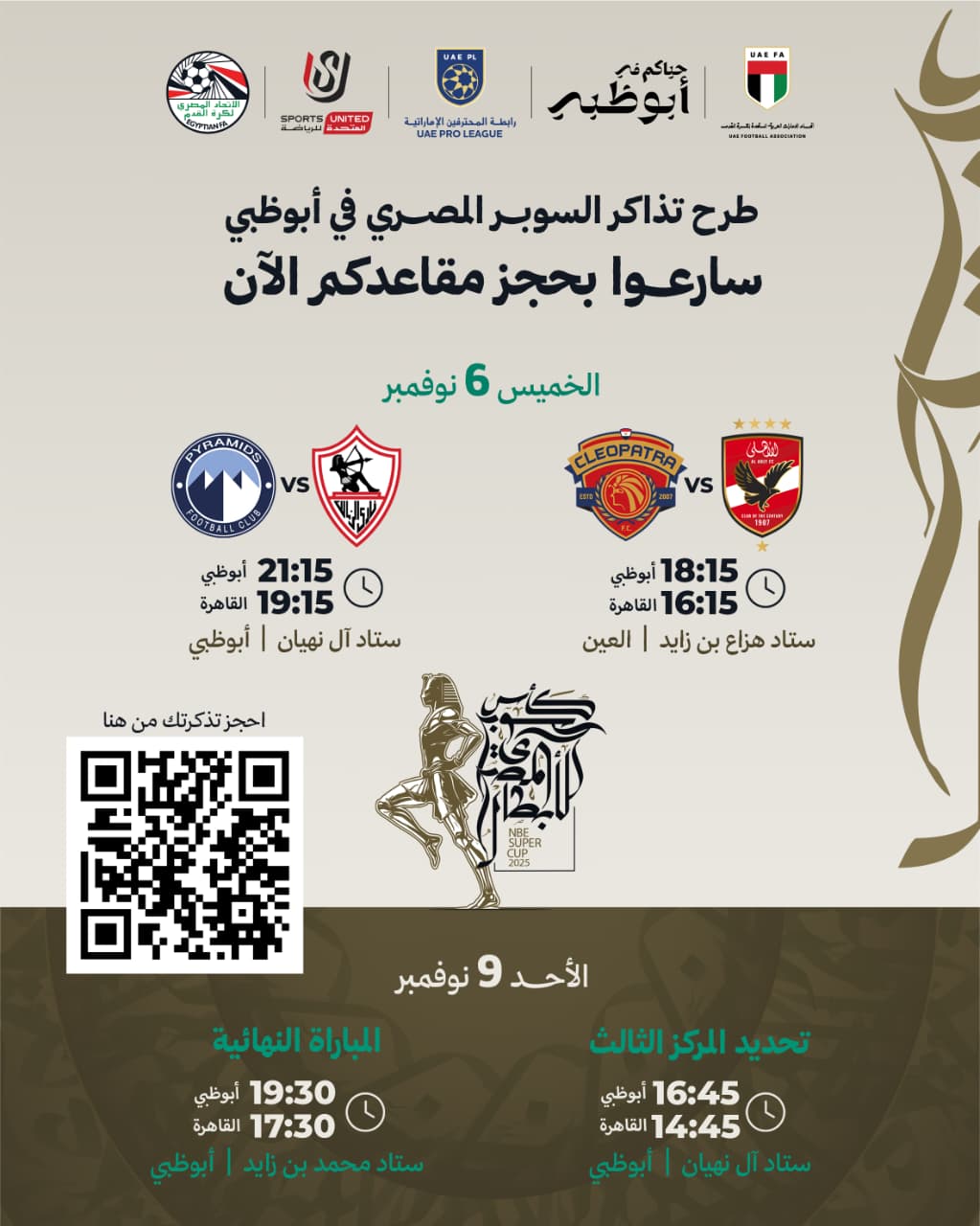 تتزايد في الساعات القليلة الماضية البحث عن تذاكر السوبر المصري 2025، البطولة المقرر أن تستضيفها إمارة أبو ظبي في الفترة بين 6 إلى نوفمبر المقبل بمشاركة 4 أندية.