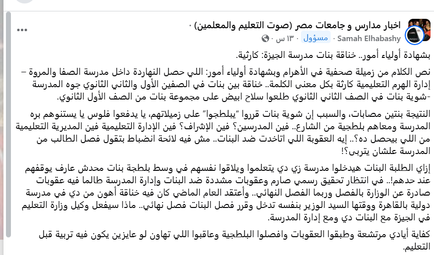 وتابعوا بأن الأمر أسفر عن إصابة بنتين، وهذا بسبب قيام طلاب الصف الثاني الثانوي بفرض (إتاوة) على بنات الصف الأول الثانوي، وفي حال رفضوا دفع المبلغ الذي حددوه يقوموا بانتظارهم خارج المدرسة ويقوموا بضربهم، مشددة على عدم وجود الأمان داخل المدرسة على البنات.