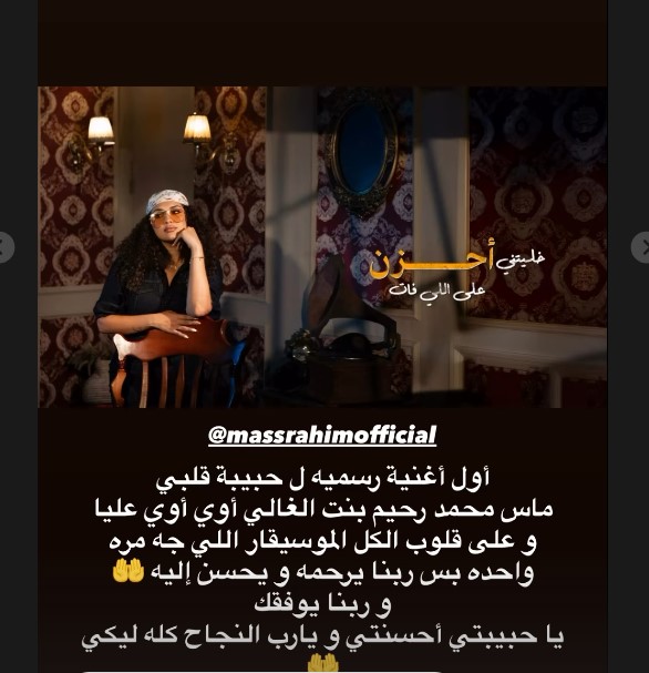 وكتب : “أول أغنية رسمية لـ حبيبة قلبي ماس محمد رحيم بنت الغالي أوي أوي عليا وعلى قلوب الكل الموسيقار اللي جه مرة واحدة بس ربنا يرحمه ويحسن إليه، وربنا يوفقك يا حبيبتي أحسنتي ويارب النجاح كله ليكي”.