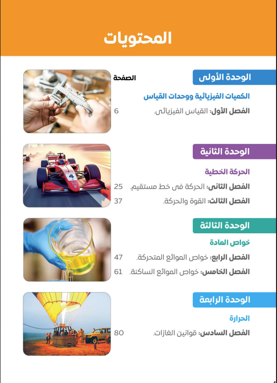 - الوحدة الثالثة: خواص المادة، تتكون من فصلين، وهما خواص الموائع المتحركة، وخواص الموائع الساكنة