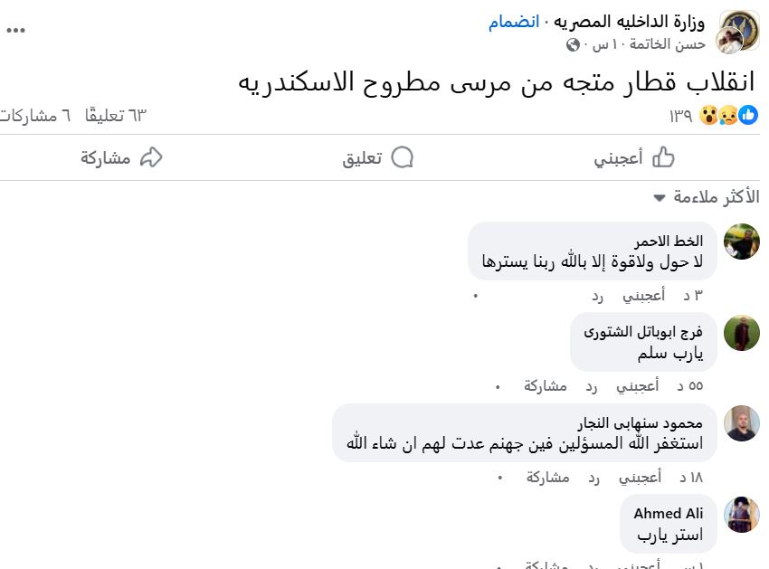 وأشار المصدر، إلى أن الصفحات التي قامت بترويج خبر انقلاب قطار مطروح تسعى لجذب المشاهدات وتحقيق الترند، في ظل غياب الوعي لدى البعض الذين يعيدون نشر مثل هذه الأخبار دون التأكد من مصدرها، ما يسهم في نشر الشائعات وتضليل الرأي العام.