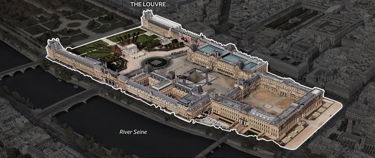 يُبرز المنظر الجوي لمتحف اللوفر الآن هرم اللوفر الشهير في الساحة المركزية، ومعرض أبولو على الجانب الجنوبي للمبنى، حيث يمتد طريق رئيسي بين المعرض ونهر السين. كما يُبرز موقع لوحة الموناليزا في معرض قريب.