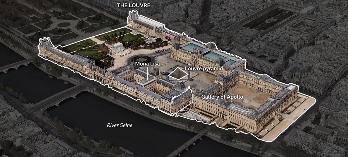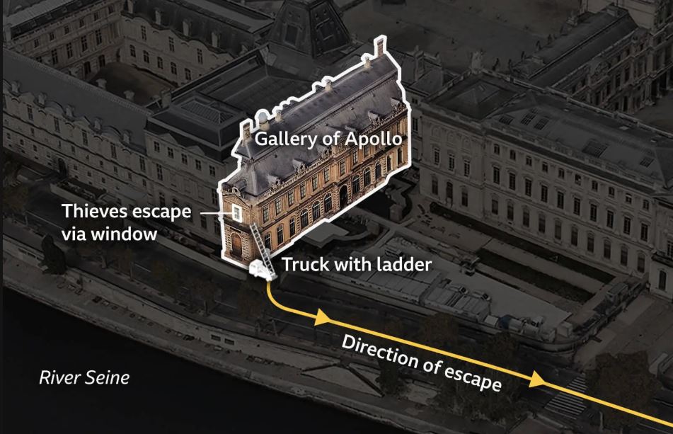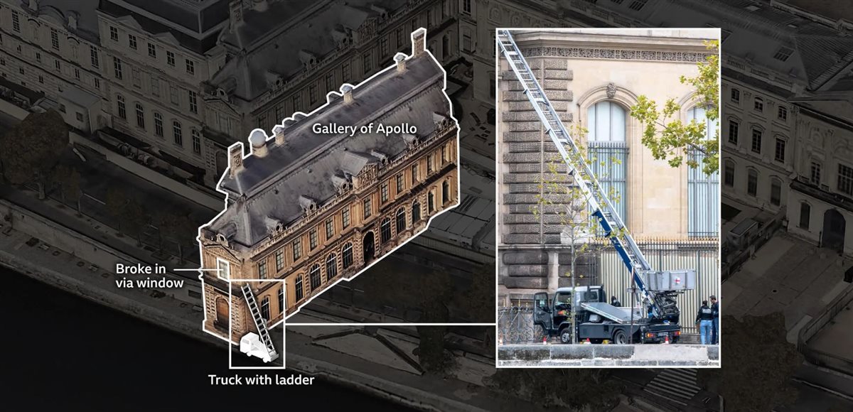 جرت الغارة المذهلة يوم الأحد في معرض أبولو، في الزاوية الجنوبية الشرقية للمتحف الأكثر زيارة في العالم، والذي يقع في قصر مترامي الأطراف على ضفاف نهر السين.