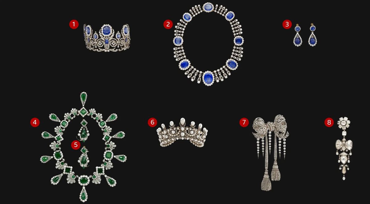 القطع الثمانية من المجوهرات الملكية الفرنسية التي سرقها اللصوص. عُرضت القطع على خلفية سوداء مع أرقامها