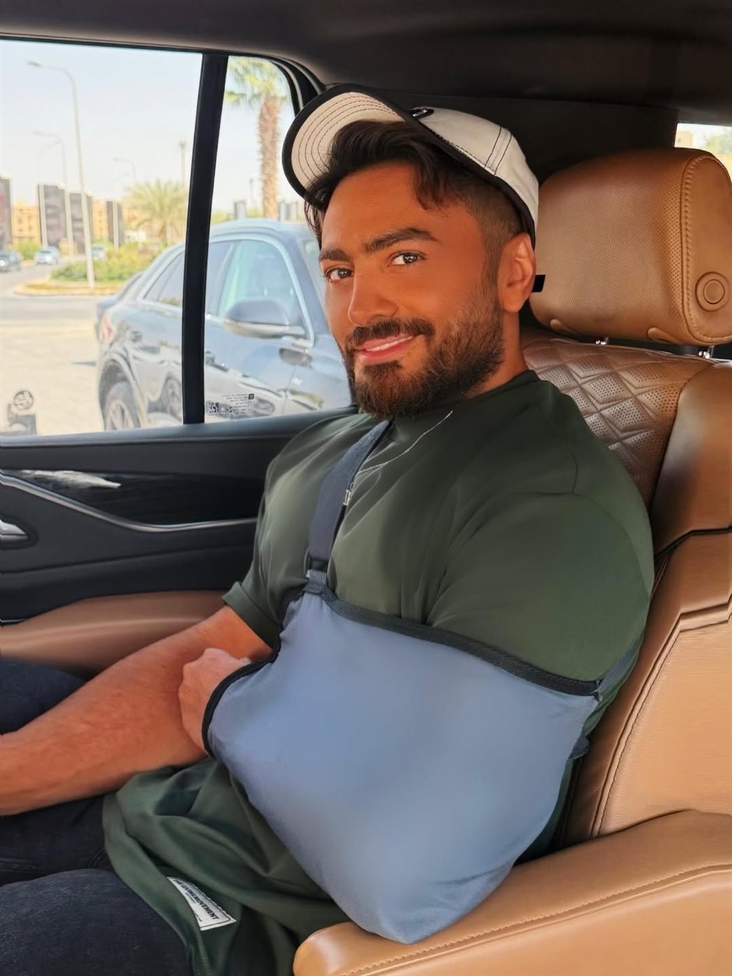 وحرص تامر حسني على أن يطمئن جمهوره ومحبيه، على صحته، وسبب ظهوره “بحمالة ذراع”.
