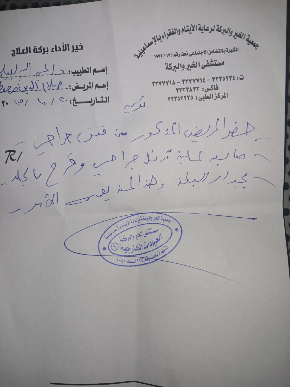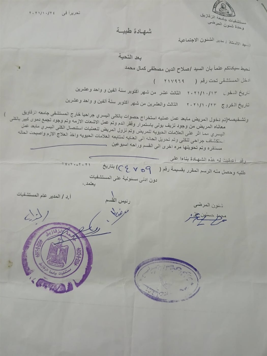 وتحمل الشهادة الطبية التي حصل عليها من مستشفيات جامعة الزقازيق، والتي تؤكد دخوله في 13 أكتوبر وخروجه في 23 أكتوبر مع توصية بالراحة لمدة أسبوعين، دلالة على حجم الأزمة التي يعيشها المريض.