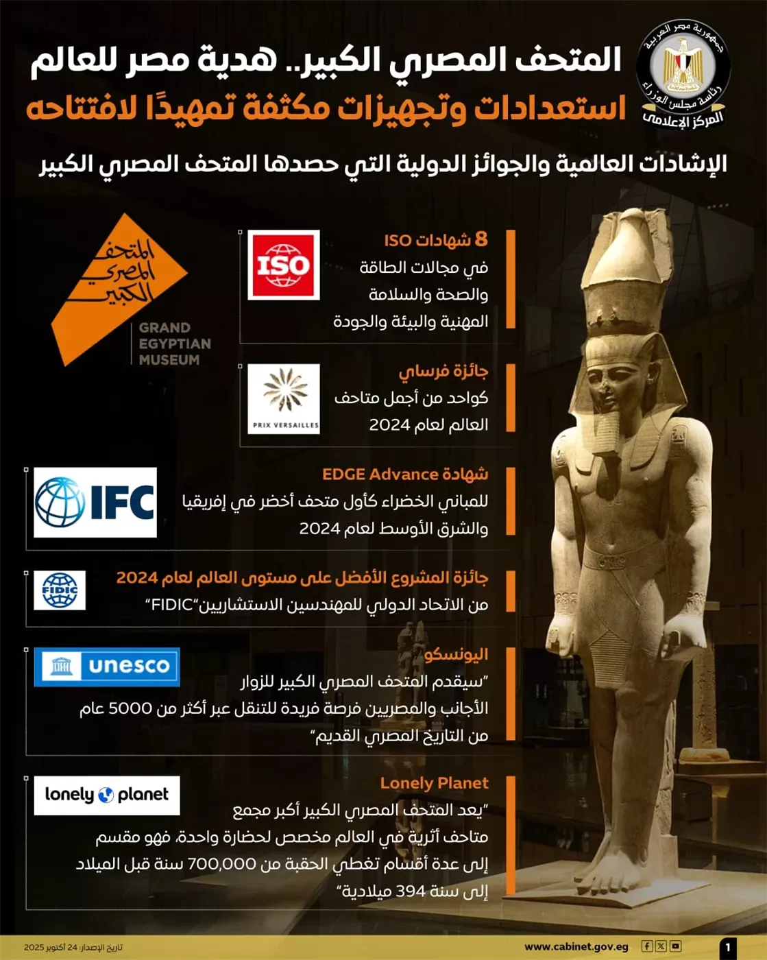 نشر المركز الإعلامي لمجلس الوزراء عدد من الإنفوجرافات على منصاته على مواقع التواصل الاجتماعي، بعنوان "المتحف المصري الكبير.. هدية مصر للعالم.. استعدادات وتجهيزات مكثفة تمهيدًا لافتتاحه".