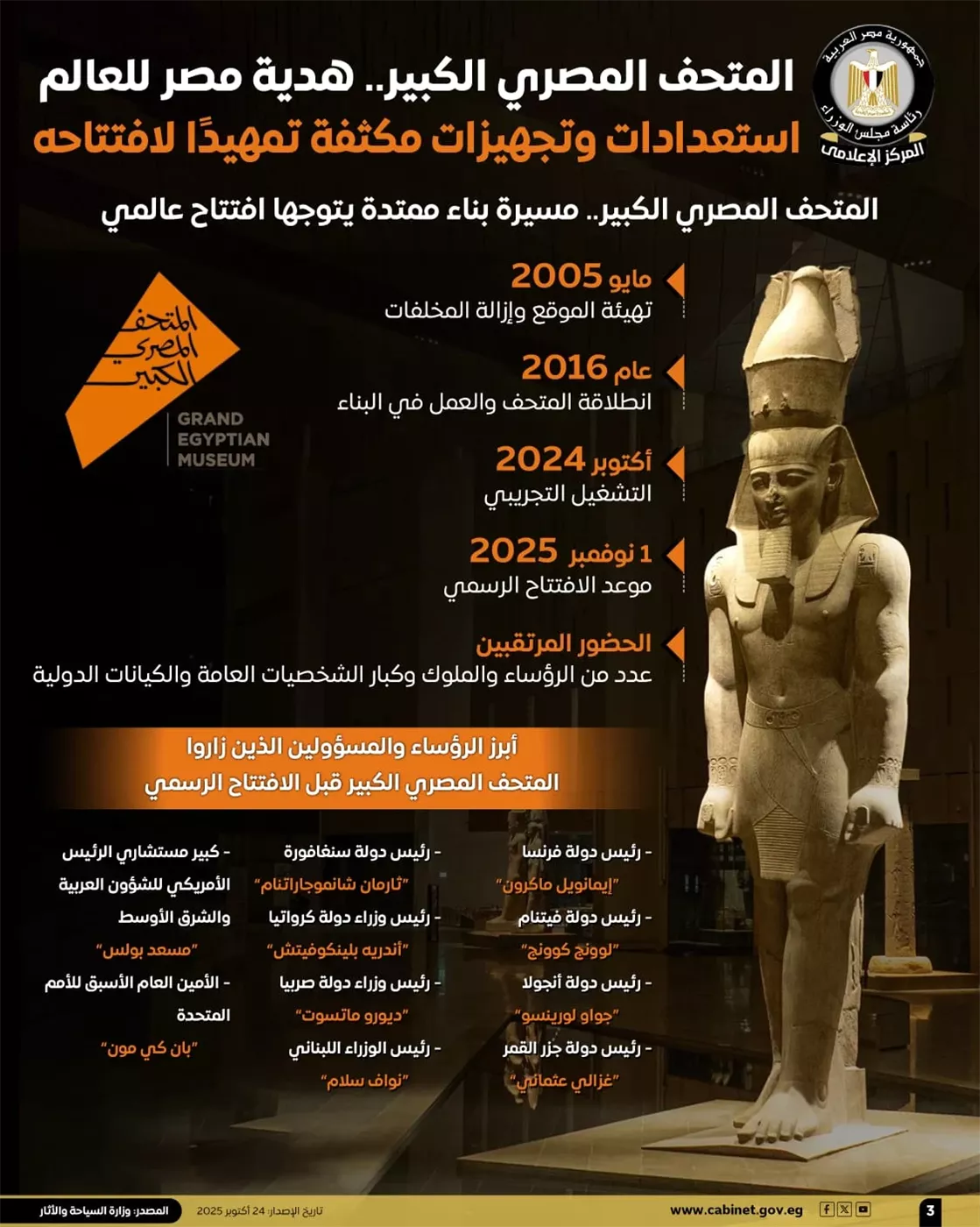واستعرضت الإنفوجرافات أيضا مراحل إنشاء المتحف في مسيرة بناء ممتدة يتوجها افتتاح عالمي، حيث بدأ العمل في تهيئة الموقع وإزالة مخلفاته في مايو 2005، ثم تأتي انطلاقة المتحف والعمل في البناء عام 2016، ليتم تشغيله تجريبيًا في أكتوبر 2024، على أن يتم افتتاحه رسميًا في 1 نوفمبر 2025.