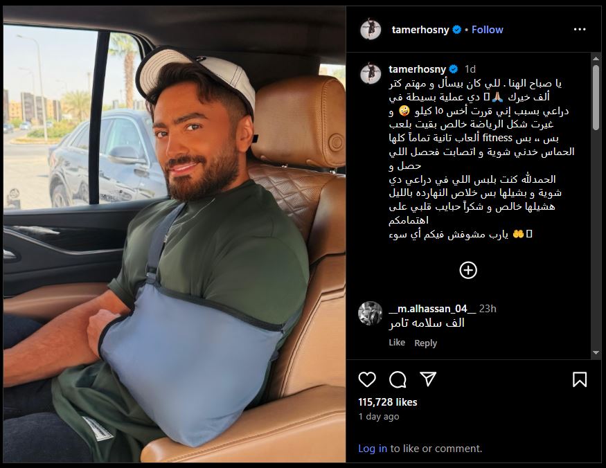 بعد أن أثار الفنان تامر حسني الجدل، بعد ظهوره مؤخرًا واضعًا جبيرة طبية على ذراعه، ولكنه عاد وأوضح عبر منشور له، أنه خضع لعملية جراحية بسيطة نتيجة تعرضه لإصابة أثناء ممارسة نوع جديد من التمارين الرياضية بعد خسارته نحو 15 كيلورامًا.