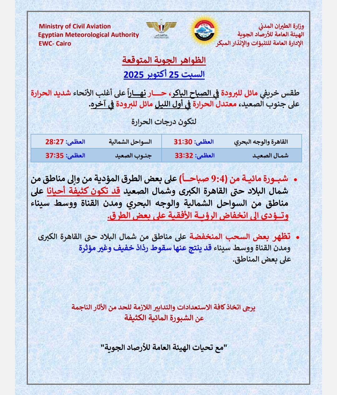 ونصحت هيئة الأرصاد المواطنين بضرورة توخي الحذر أثناء القيادة في الصباح الباكر بسبب الشبورة المائية، مع تجنب التعرض المباشر لأشعة الشمس وقت الظهيرة، ومتابعة التحديثات اليومية الخاصة بـ حالة الطقس غدا في مصر من المصادر الرسمية.